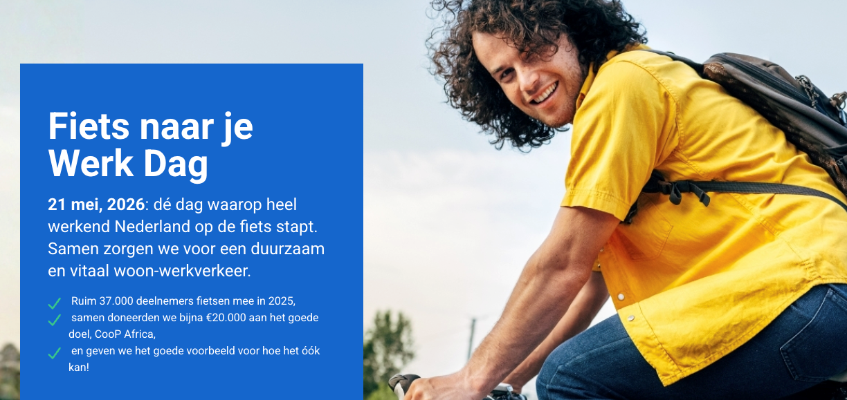 De 20e editie van de Nationale Fiets naar je Werk Dag vindt plaats op donderdag 21 mei 2026. Dit initiatief stimuleert werkend Nederland om de auto te laten staan, met ruim 37.000 deelnemers in 2025. Deelnemers kunnen zich gratis aanmelden op fietsnaarjewerkdag.nl.